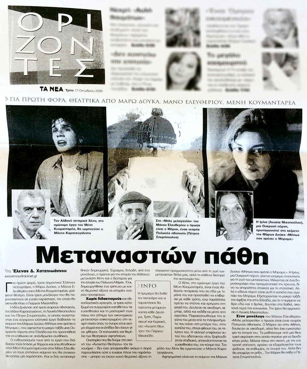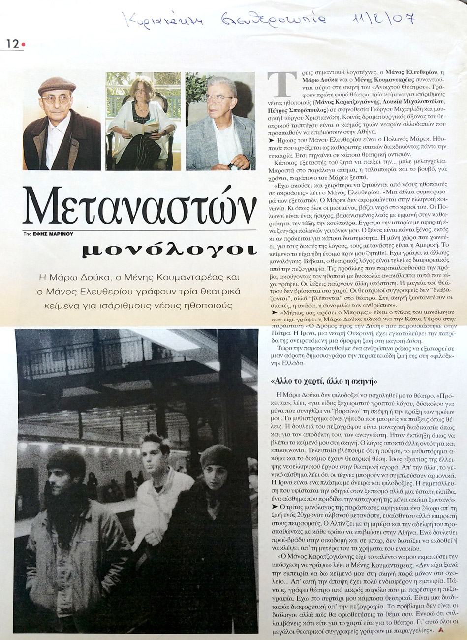 Μένης Κουμανταρέας, Μεταναστών Μονόλογοι, Επτά Ημέρες/ Έφη Μαρίνου, Κυριακάτικη Ελευθεροτυπία, 11/7/07.
