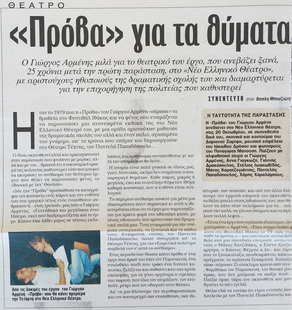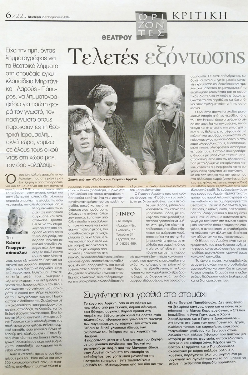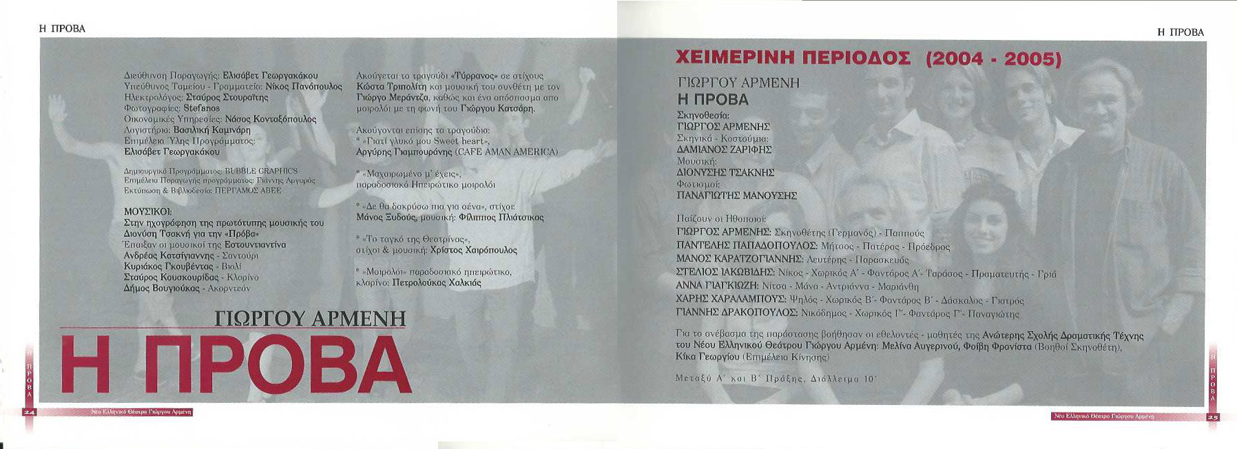 Νέο Ελληνικό Θέατρο Γιώργου Αρμένη. Πρώτη παράσταση 18.10.2004. Θεατρική περίοδος 2004-5.